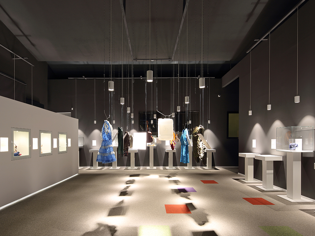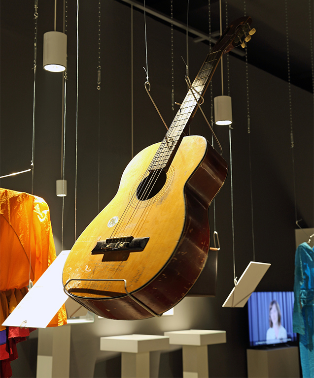 ところどころ傷や凹みがある「ギター」、そして華やかな「合唱団のユニフォーム」が展示されています。
