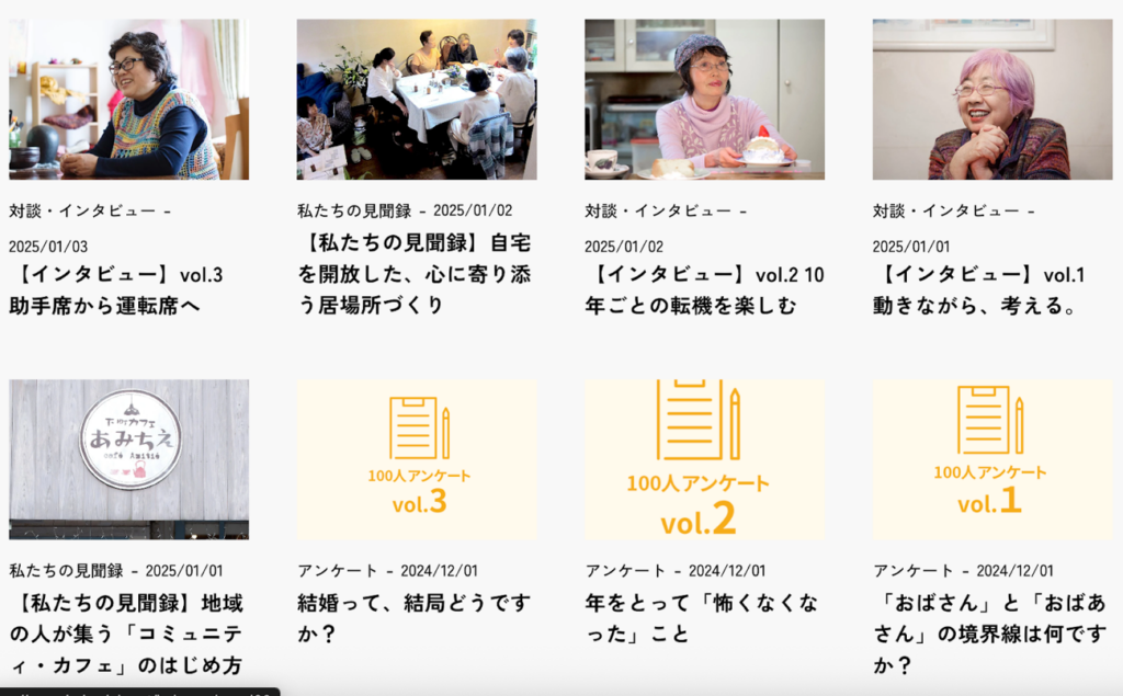 現在も、シニアやこれからシニアになる年代の人たちの声を聞くことに積極的に注力しています。これまでに公開した記事には、50〜70代の女性に行った100人アンケート<「おばさん」と「おばあさん」の境界線は何ですか?><年をとって「怖くなくなった」こと>や、長生きする時代を生きるための魅力的な取り組みを取材する『私たちの見聞録』などがあります。